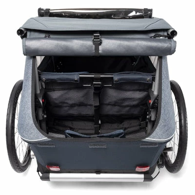 Du côté des enfants, les sièges de la Vaaya 2 places sont entièrement repensés. Pourvus de généreux appuie-têtes et d’un harnais aux bretelles rembourrées, les deux sièges ergonomiques sont en tissu climatex®. Le climatex® garantit une évacuation rapide de l’humidité, pour éviter l’accumulation de sueur dans les petits dos. Les grandes fenêtres latérales, ainsi que la fenêtre de la bâche anti-pluie, sont certifiés UPF 80+ contre le soleil. Les enfants peuvent profiter du paysage sans craindre les coups de soleil. Et s’il fait bien chaud, vous pourrez rouler la bâche et dérouler la moustiquaire protectrice : vos enfants sentiront la brise rafraîchissante.