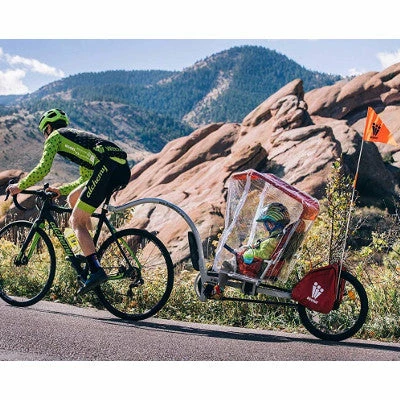 Encore plus pratique, découvrez aussi la remorque vélo enfant Weehoo Thrill vendue avec un toit et une protection pluie.