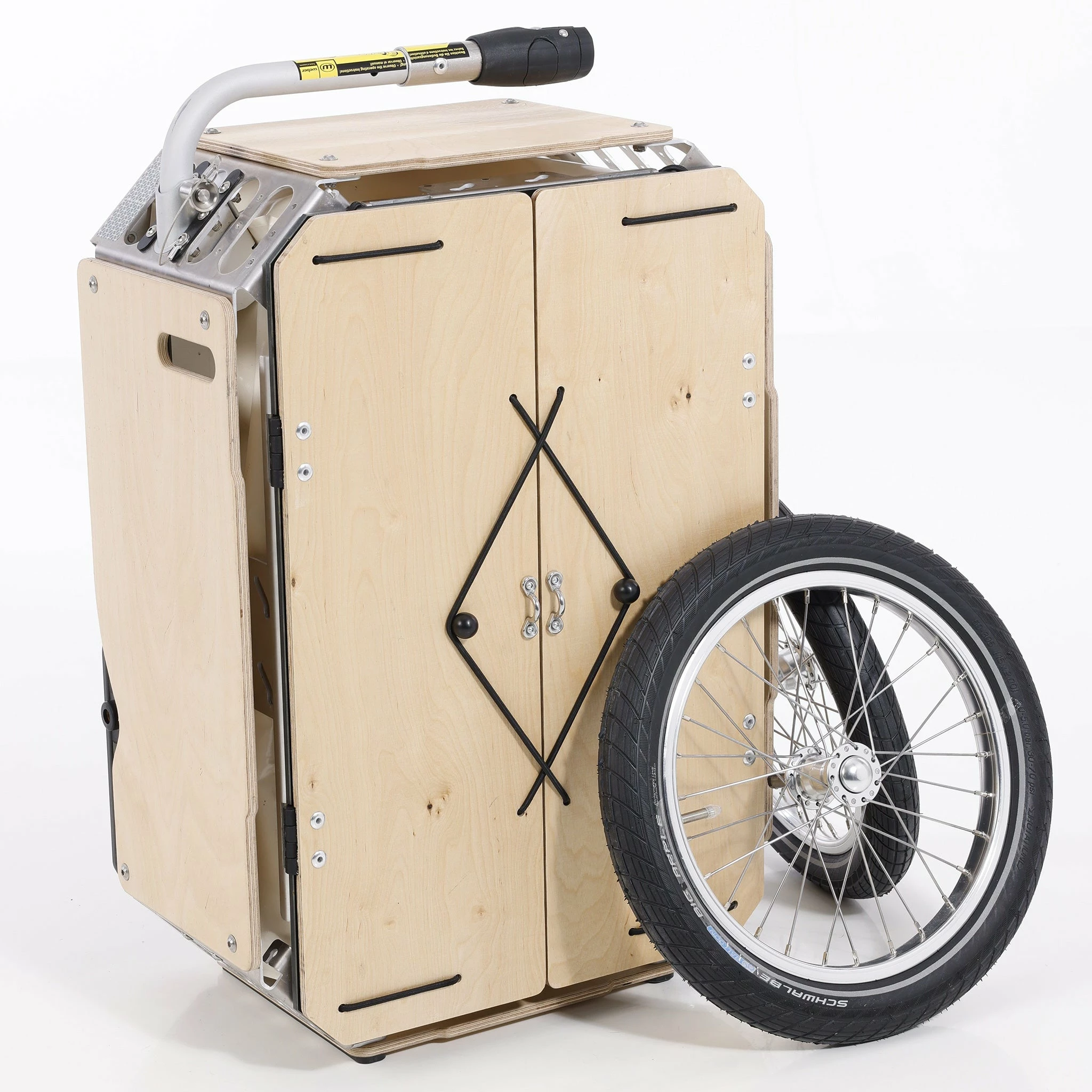 La remorque Arca de Carette est fabriquée en France et est issue d’une fabrication éco-responsable avec des matériaux durables et des fournisseurs locaux. La structure est en aluminium et l’habillage externe est en bois vernis 2 couches stratifié haute pression. La visserie est en inox haute qualité utilisé dans la marine. Les charnières sont en techno polymère et en aluminium. Enfin, la trappe amovible est en bouleau vernis. La housse intérieure est déhoussable et lavable. Et tous les éléments sont démontables et réparables. Les roues se détachent et peuvent se ranger à l’intérieur de la caisse pour un rangement optimisé.